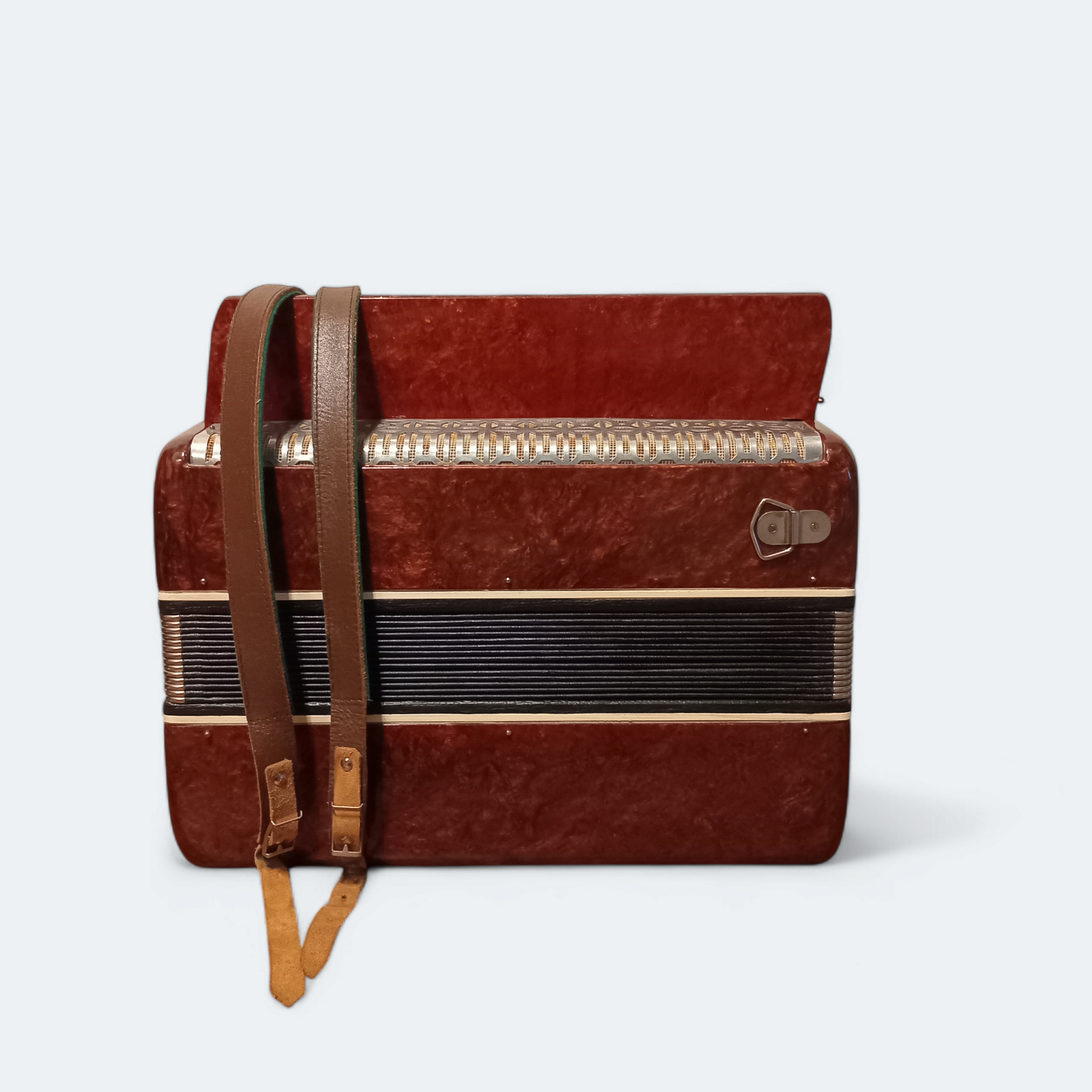 This accordion is in full working order and is in excellent condition, having been well-preserved. One of the buttons is not original but operates normally.