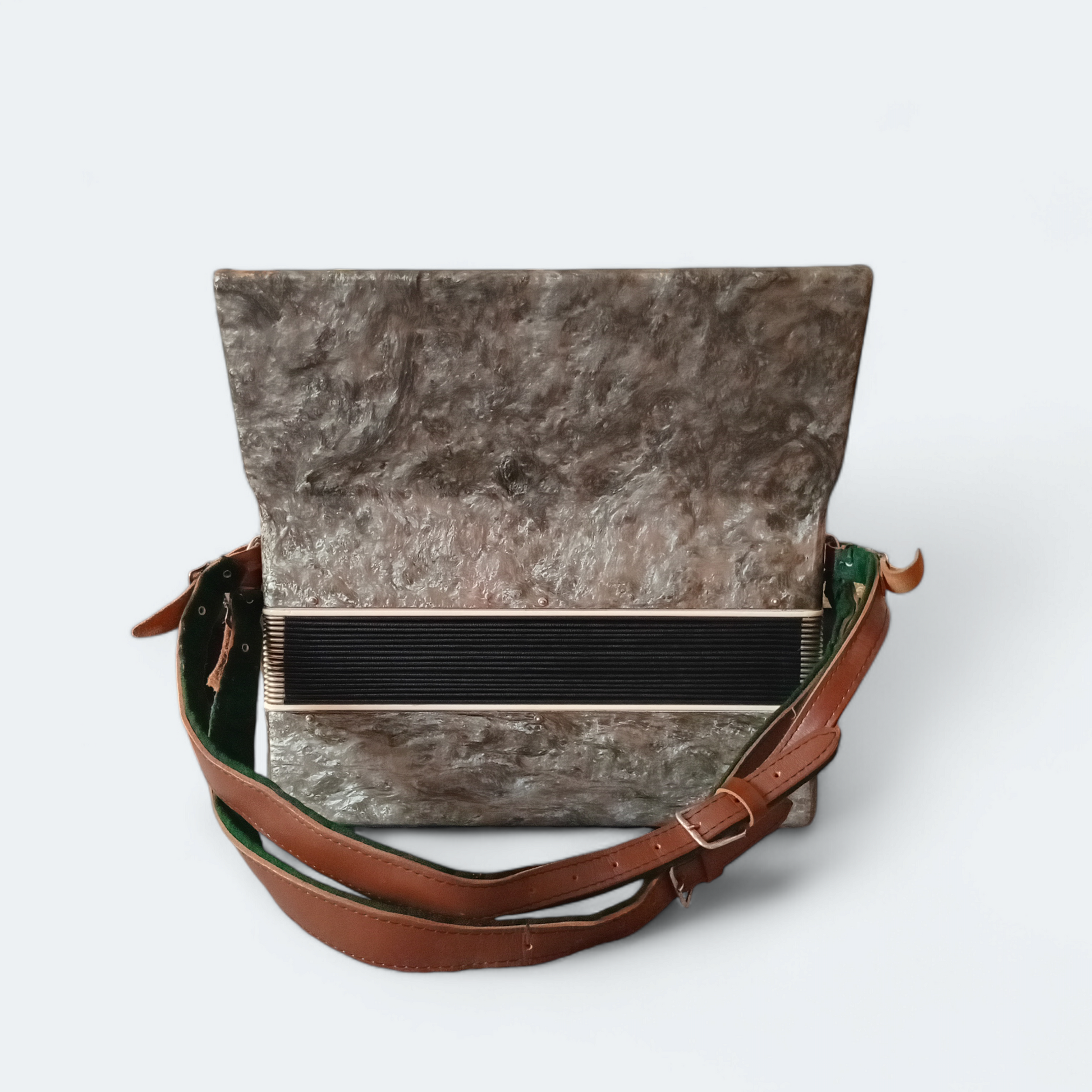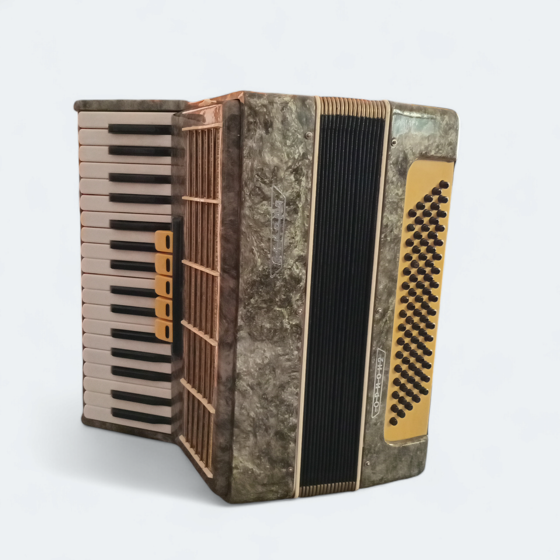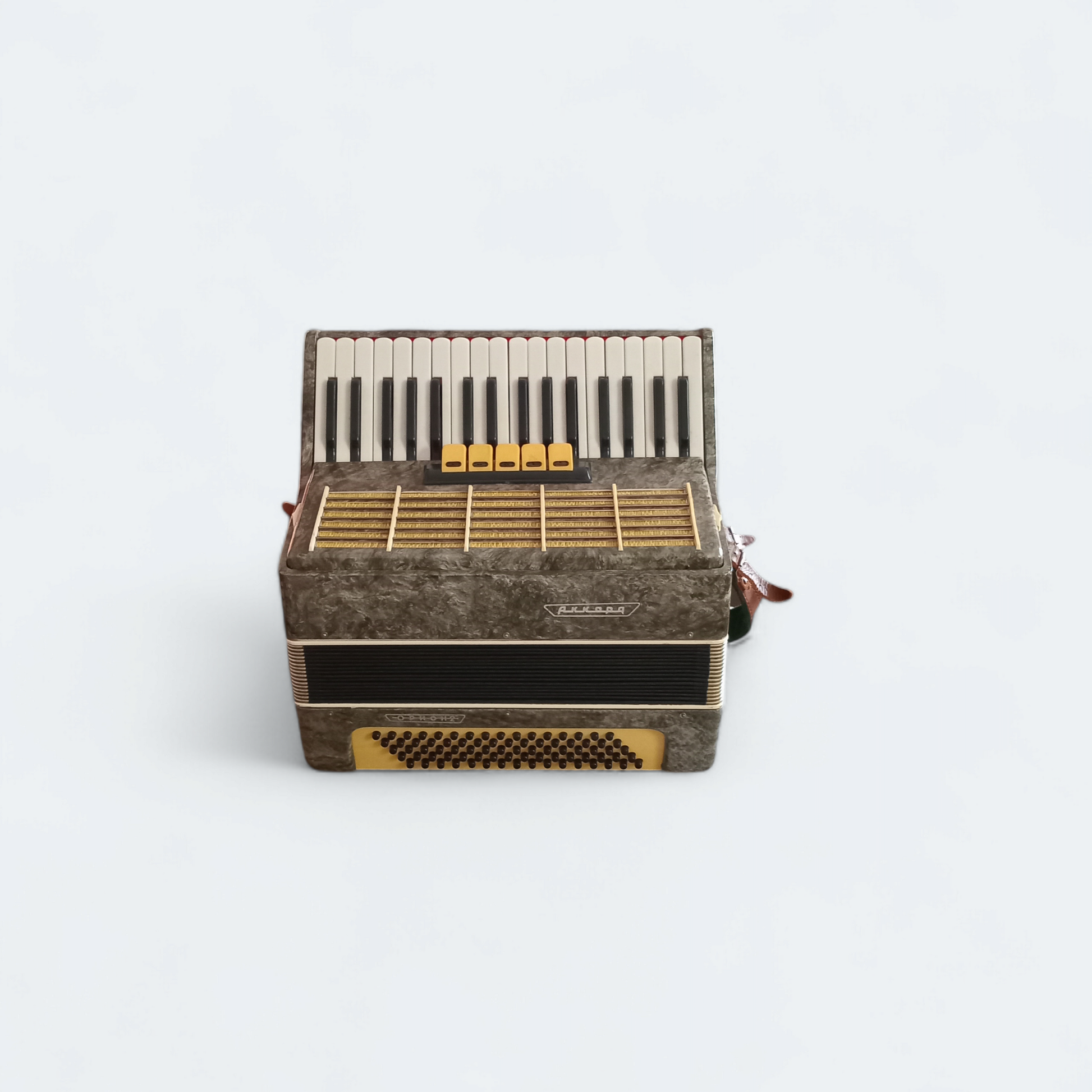 The piano accordion is characterized by a right-hand keyboard that closely resembles that of a piano or organ. Its keys are designed to be more rounded, smaller, and lighter than those found on traditional pianos.