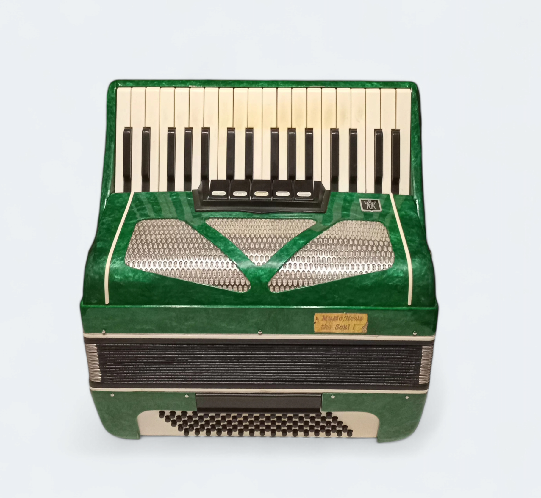 This piano accordion is designed with a right-hand keyboard that mimics the layout of a piano or organ, featuring keys that are smaller, lighter, and more rounded than those found on conventional pianos.