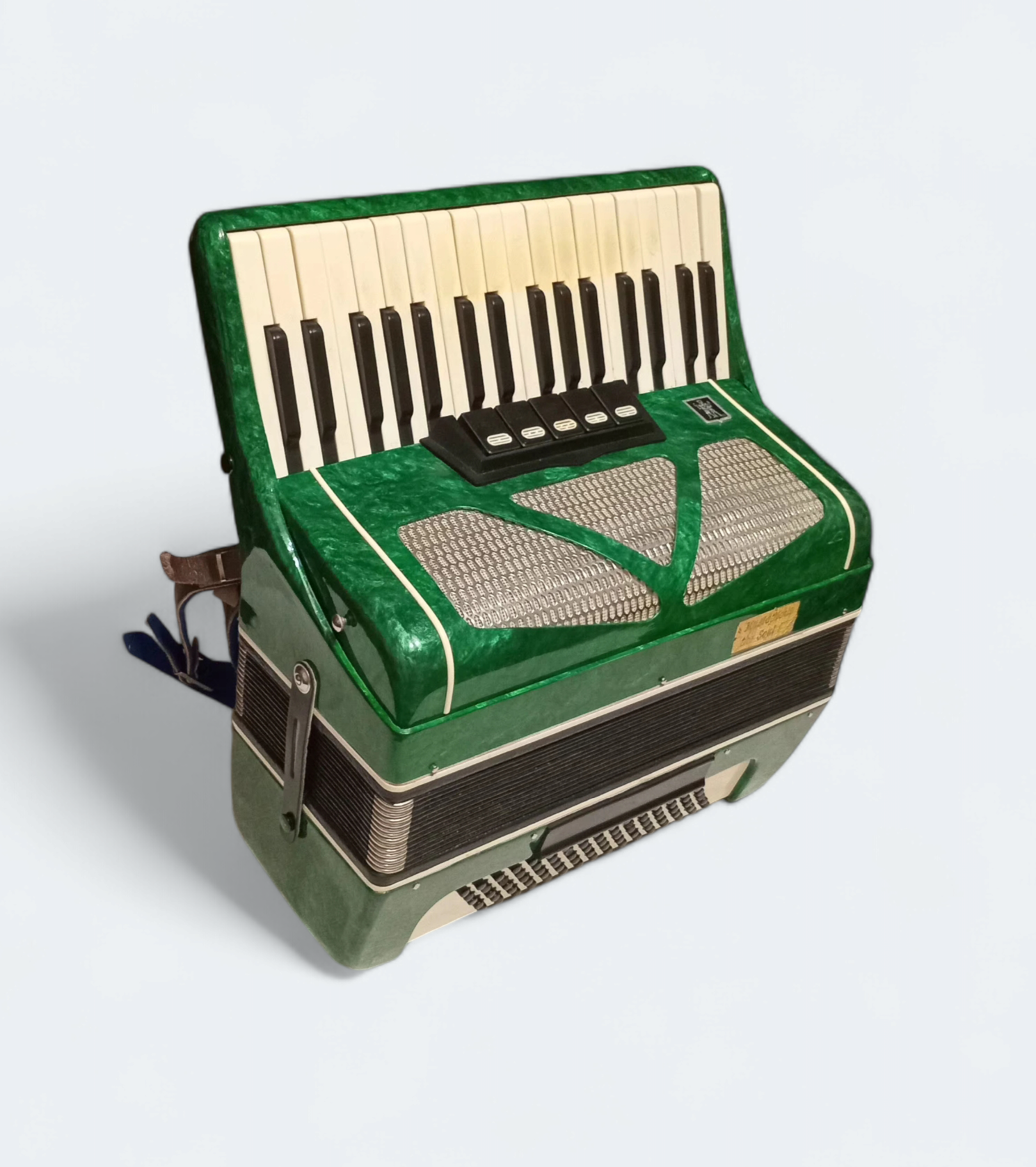 This accordion is in excellent working order and has experienced minimal use throughout the years. While the buttons have slightly changed color over time, this does not impact its performance or playability. The instrument continues to deliver a rich sound quality and dependable functionality.