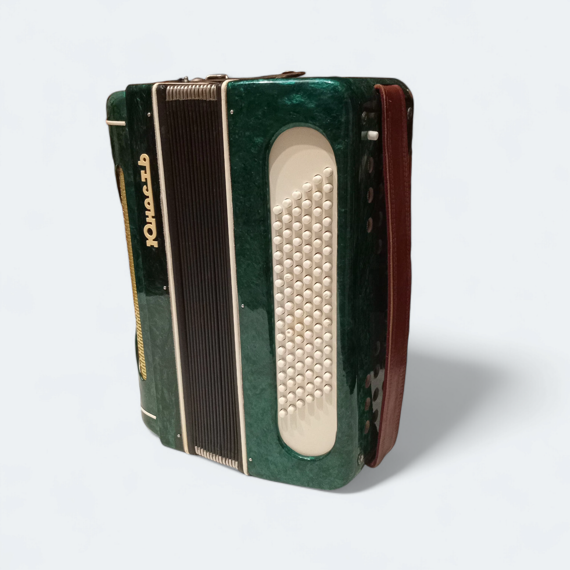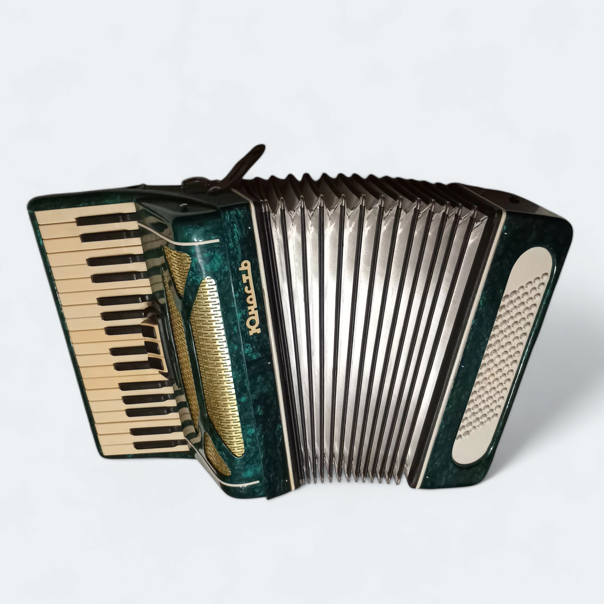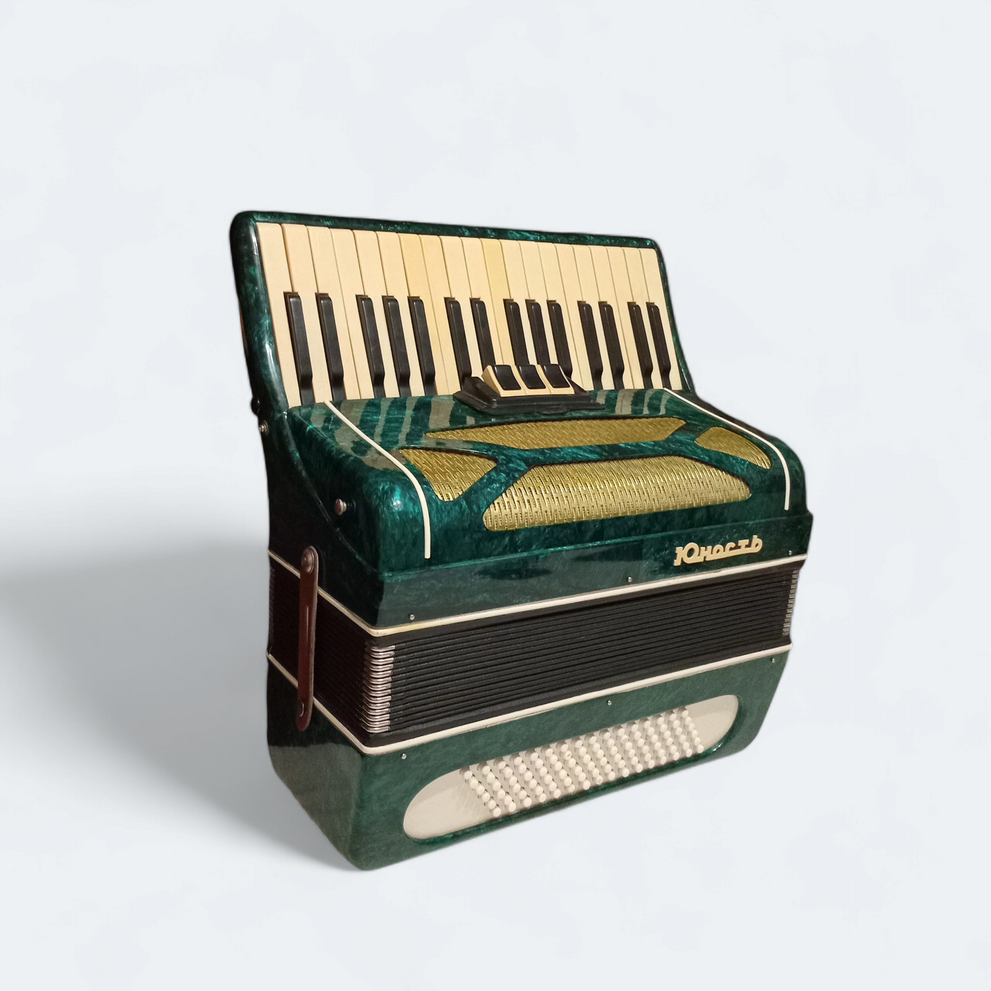 Vintage Soviet Piano Accordion Yunost, which translates to "youth."