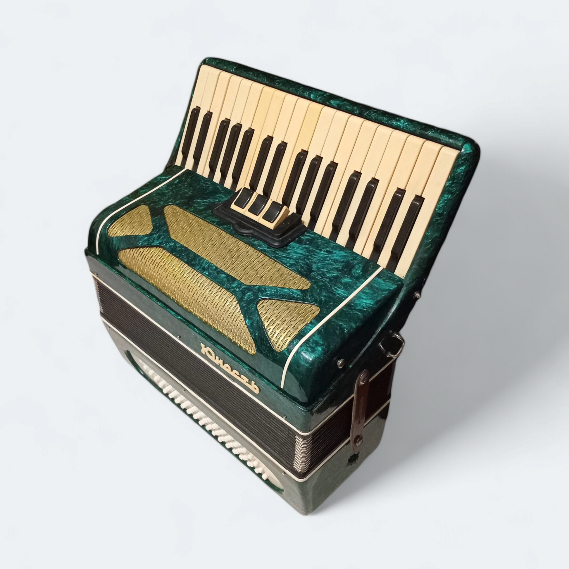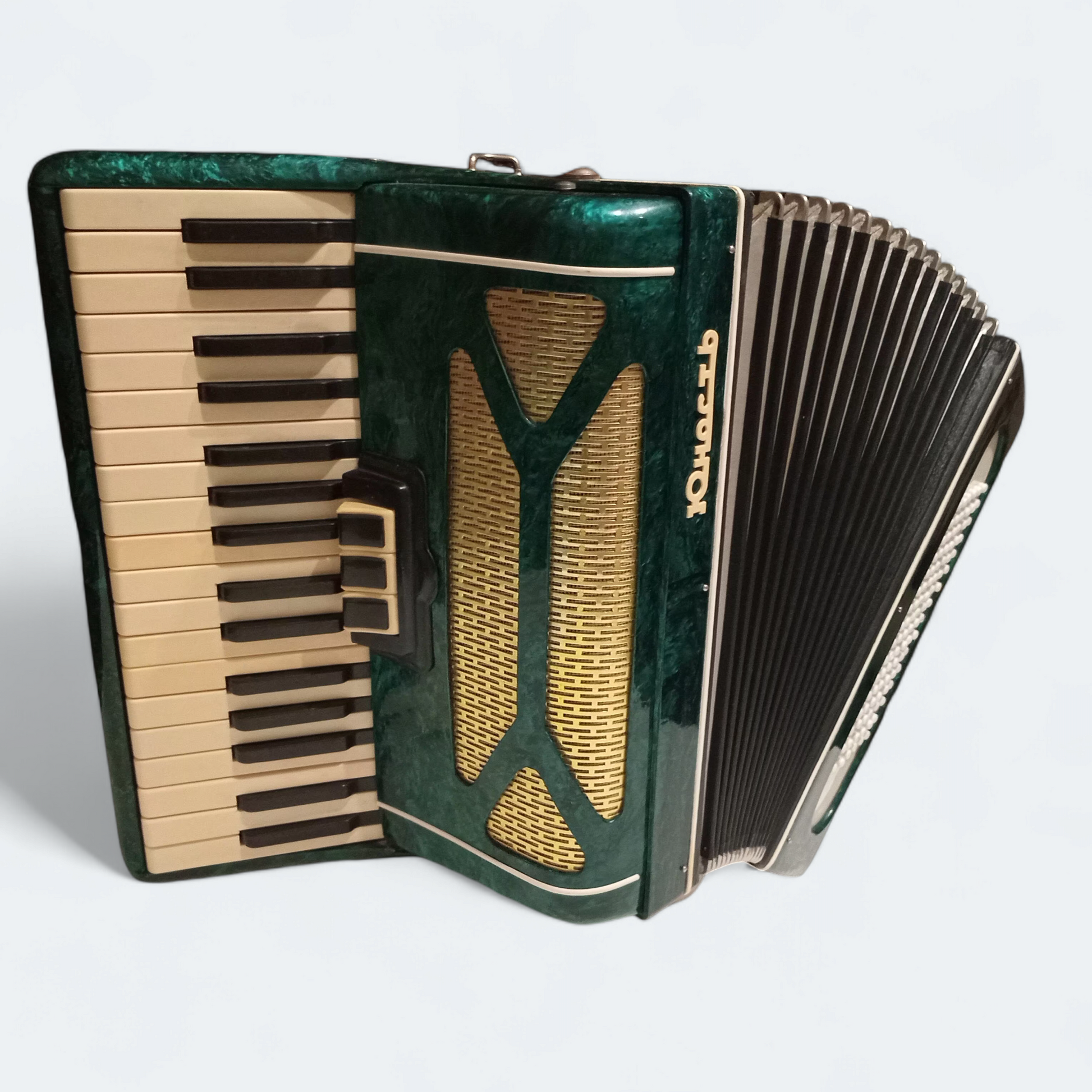This piano accordion is equipped with a right-hand keyboard that closely mimics the layout of a piano or organ, featuring keys that are smaller, lighter, and more rounded than those typically found on conventional pianos.